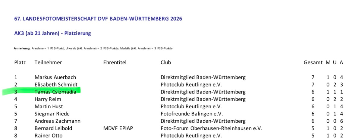 DVF-BW Landesfotomeisterschaft 2026: Csizmadia Tamás bronz